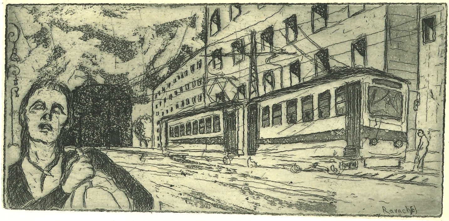 Le départ, trenino giallo, eau-forte et aquatinte, 12 x 5.5 cm, 2023