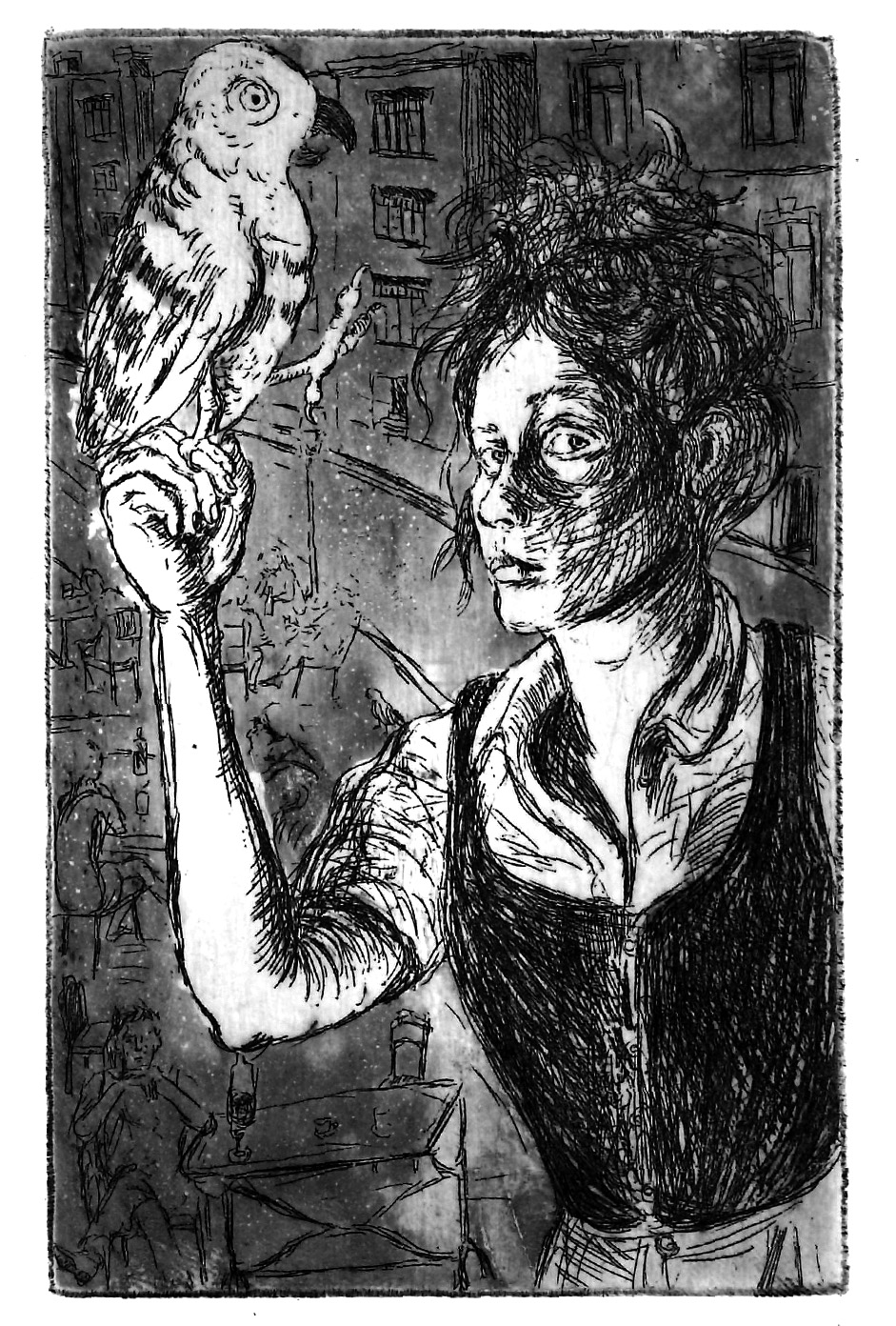 Autoportrait au perroquet ou comment passer inaperçue devant la foule avachie au café, eau-forte et aquatinte, 7 x 11 cm, 2021