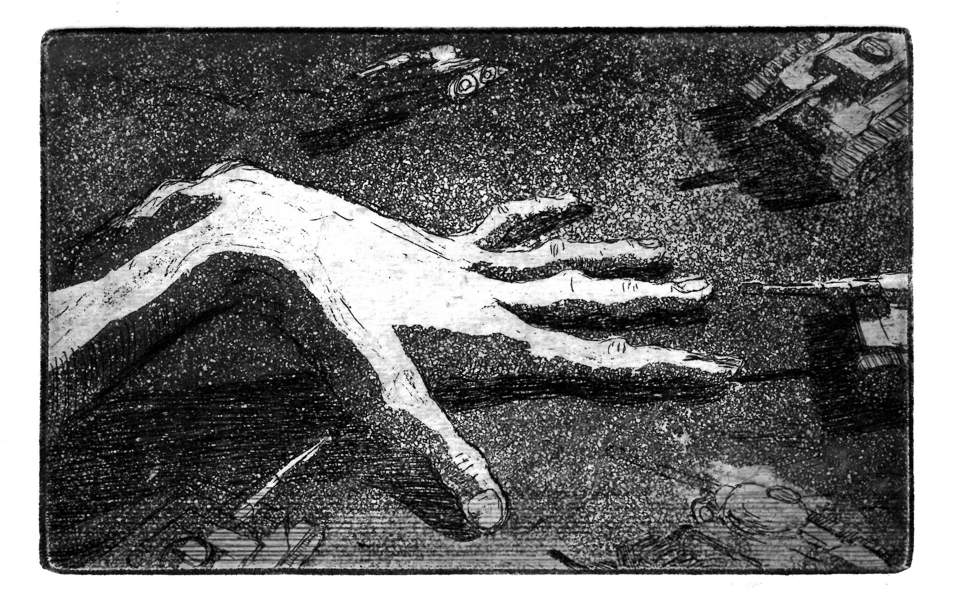 La main traquée-matraquée, eau-forte et aquatinte, 10x 15 cm, 2022